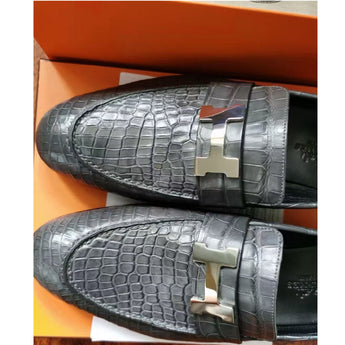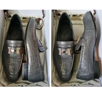 Hermès Paris SO Himalaya Loafers are a statement of luxury and exclusivity, crafted from the rare and highly coveted “Himalaya” crocodile leather. This exotic leather is known for its subtle gradient of  smoky grey, recalling the majestic Himalayas. The loafers boast a sleek, classic silhouette with a smooth, seamless design, offering both sophistication and comfort. They are often detailed with refined stitching, and may feature subtle metallic hardware, like the iconic Hermès “H” emblem. These loafers are a blend of impeccable craftsmanship and timeless elegance, perfect for those who seek unparalleled luxury in footwear.