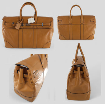 An elegant accessory for trips out of town, The vachetta leather provides the bag with remarkable softness and lightness.. The magnetic closure and metal hardware are personalized with the Brunello Cucinelli logo. An adjustable shoulder strap can be added to make carrying easy.