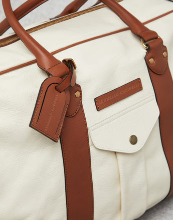 A hybrid of sporty inspiration and a functional look, this street bag enriches the practicality of a classic duffel bag by using refined materials. The surface combines the natural grain of calfskin with the smooth, matte texture of cowhide, enhancing the leather's handcrafted finish. Two practical exterior pockets, one with a gusset in the front and the other with a zipper in the back, allow you to always have your small essentials within reach. The adjustable and detachable shoulder strap makes carrying easy.