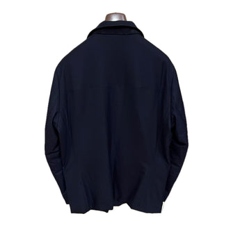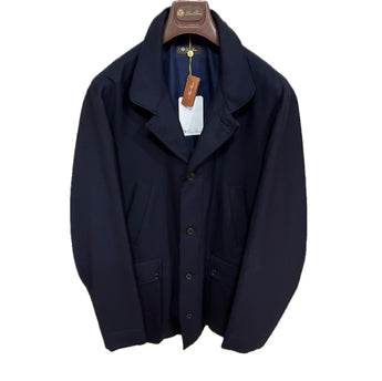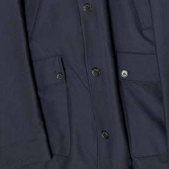 Impeccable jacket crafted from “The Gift of Kings®” wool. Exclusively selected by Loro Piana and measuring only 12 microns in diameter, this is the finest wool in the world. The jacket is treated with Rain System® for a water-repellent finish, and lined in silk. Overcoat length. For true connoisseurs.